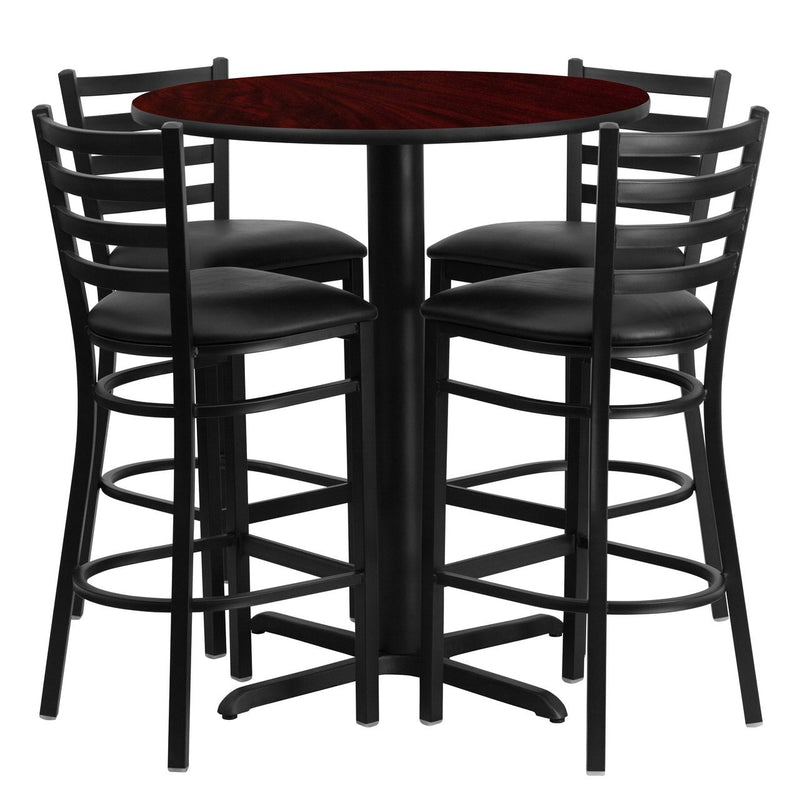 30'' Round Mahogany Laminate Table Set with 4 Ladder Back Metal Barstools